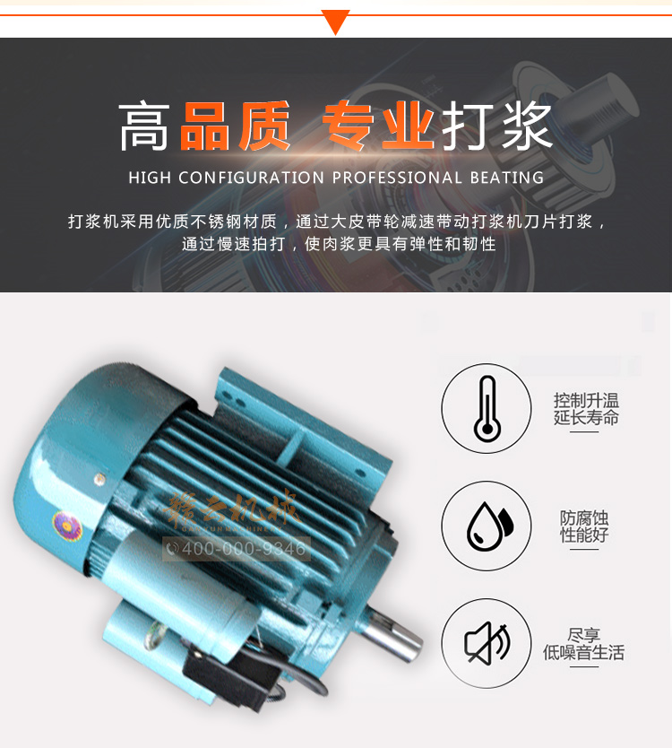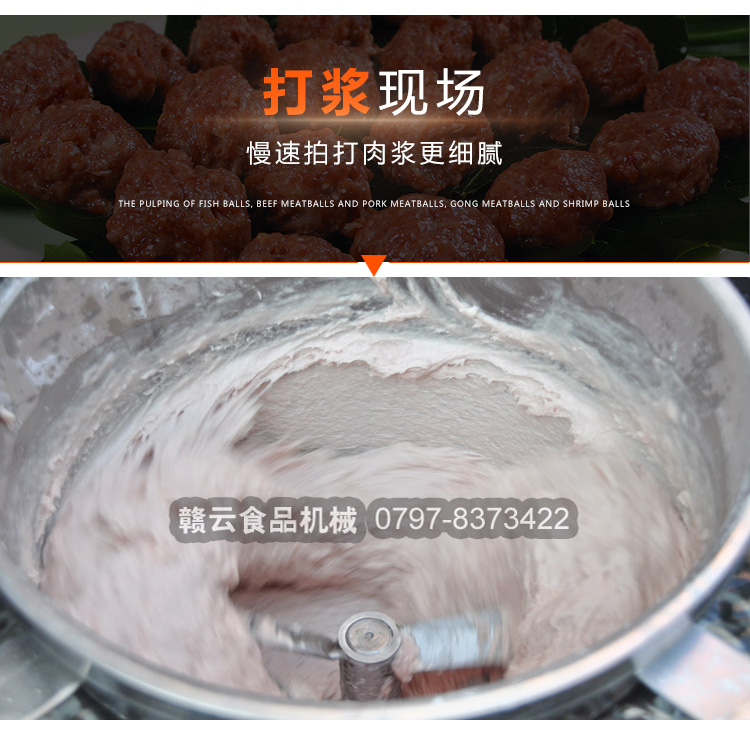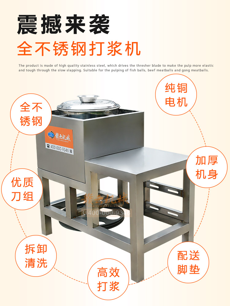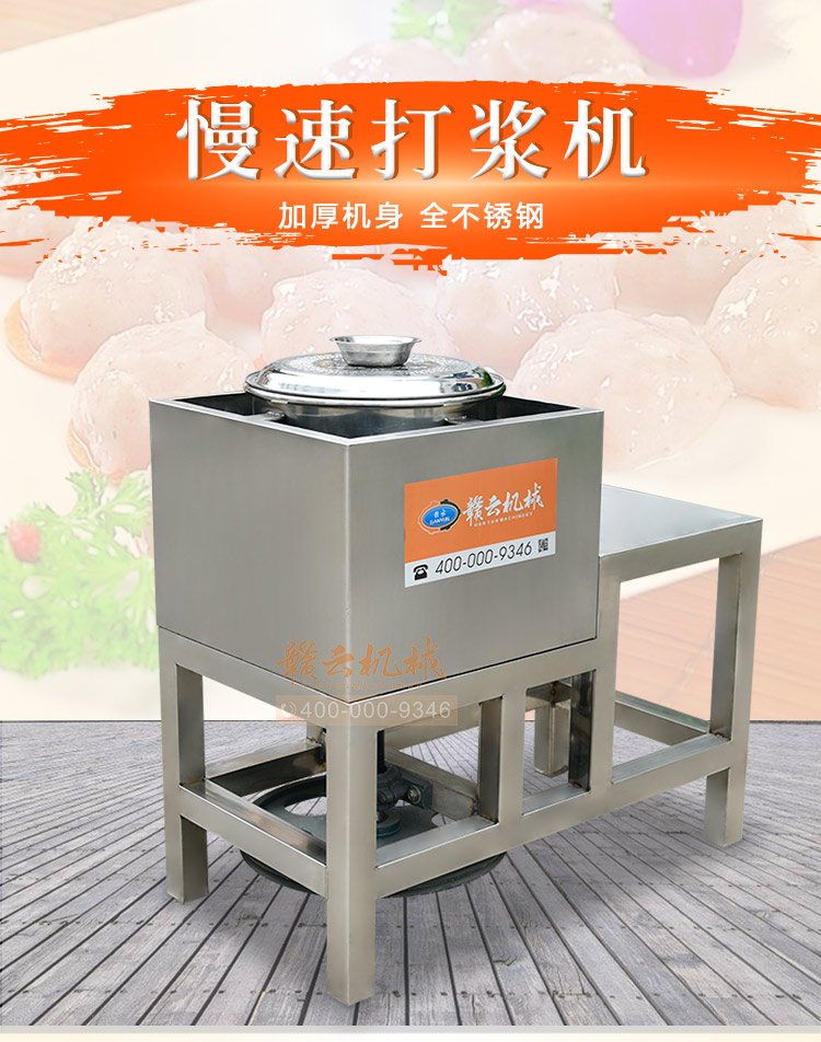 贛云牌全不銹鋼慢速魚丸、肉丸打漿機(jī)采用優(yōu)質(zhì)不銹鋼材質(zhì),通過大皮帶輪減速帶動(dòng)打漿機(jī)刀片打漿,通過慢速拍打,使肉漿更具有彈性和韌性。適合魚丸、牛肉丸和貢丸的制漿之用。