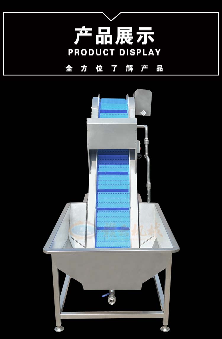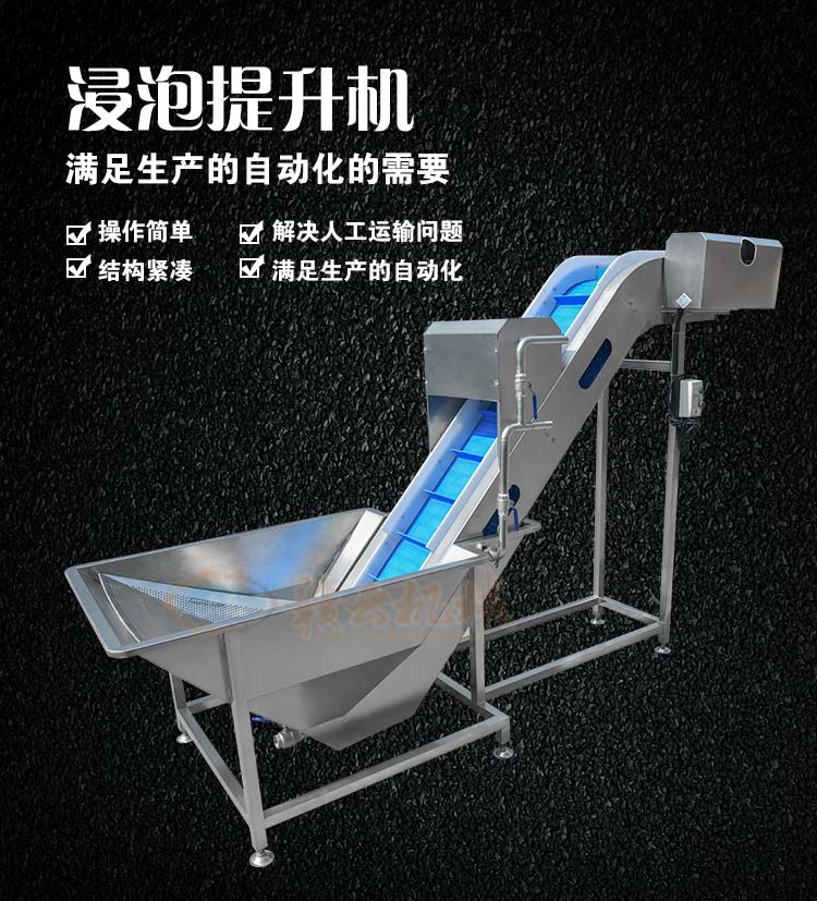 本機(jī)主要起提升和輸送的作用,浸泡清洗機(jī)是由水箱和提升機(jī)組合而成的機(jī)械,物料先倒入水槽后浸泡,在由提升機(jī)進(jìn)行提升給下一道工序。解決人工入料困難的問題;在流水生產(chǎn)線中,該設(shè)備通常和其他入料口要求高的設(shè)備搭配使用,滿足生產(chǎn)的自動(dòng)化的需要。該機(jī)具有操作簡(jiǎn)便、結(jié)構(gòu)緊湊、造型美觀、維修方便等優(yōu)點(diǎn)。