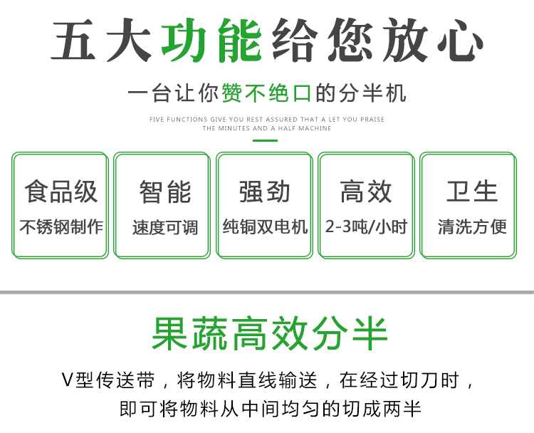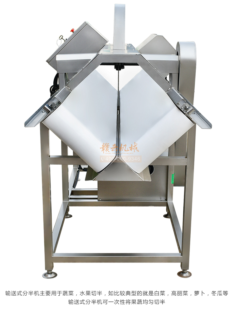 切半機(jī)主要用于果蔬類蔬菜加工??蓪A形,橢圓性,長(zhǎng)條形,等物料,切割成兩半。該設(shè)備常用于以下一些場(chǎng)所,泡菜加工,果蔬類加工廠,政府機(jī)關(guān)單位,無(wú)刀化廚房等。該設(shè)備物料切割勻稱,分半大小一致,大顆的白菜蘿卜冬瓜都可一次性分割成兩半。是果蔬加工行業(yè)的好幫手
