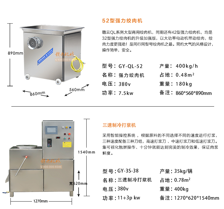 本套設(shè)備由:52型強(qiáng)力絞肉機(jī)、三速制冷打漿機(jī)、單刀高速肉丸成型機(jī)和1500型智能溫控雙加熱水槽設(shè)備組合而成、專業(yè)生產(chǎn)牛肉貢丸,豬肉丸,日產(chǎn)貢丸可達(dá)三噸。