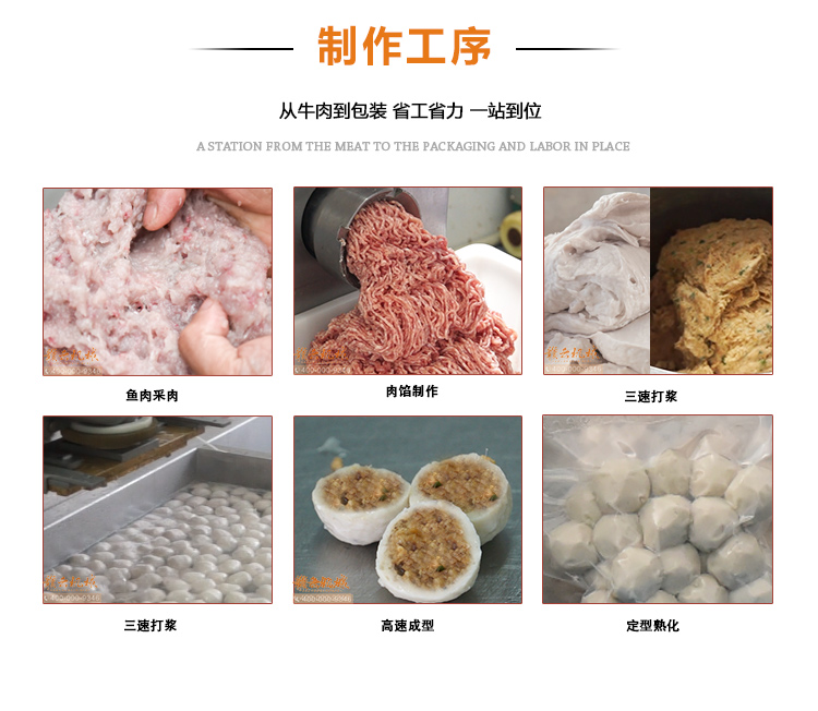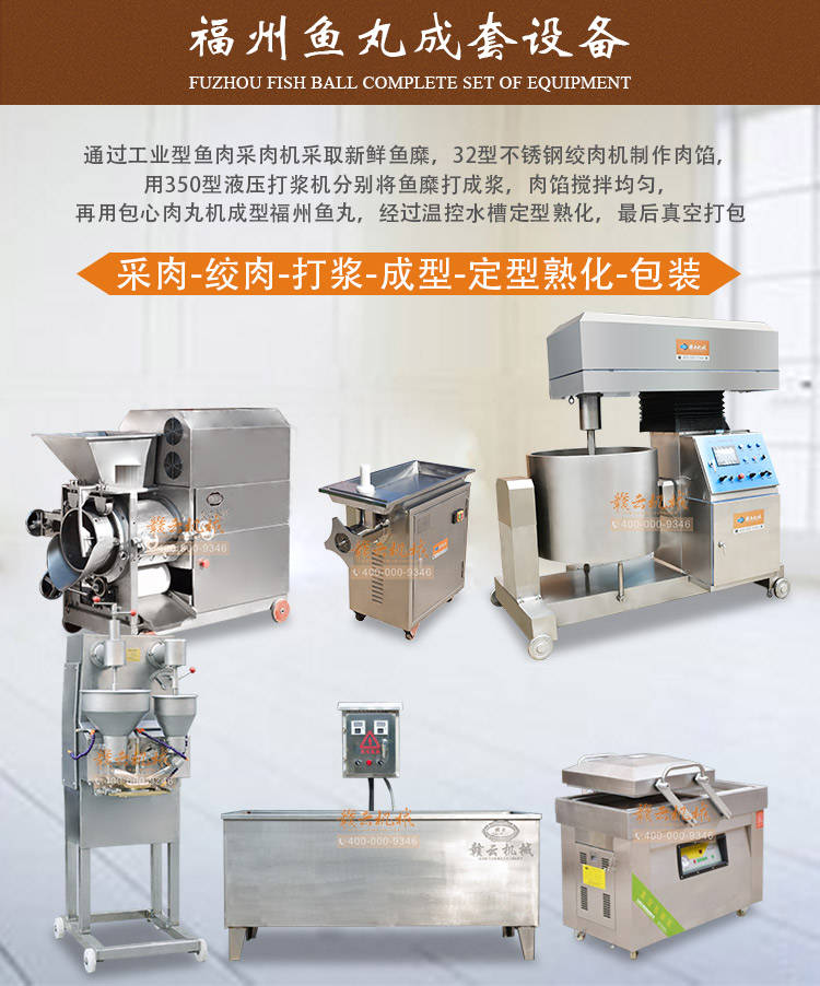 福州魚丸成套設(shè)備,時產(chǎn)500kg配套組合,采用新鮮淡水魚或海魚為原料加工,通過350工業(yè)型魚肉采肉機采取新鮮魚糜,用350型液壓打漿機調(diào)制成漿,32型不銹鋼絞肉機制作肉餡,用第三代包心肉丸機成型福州魚丸,后經(jīng)過熟化定型水槽定型熟化