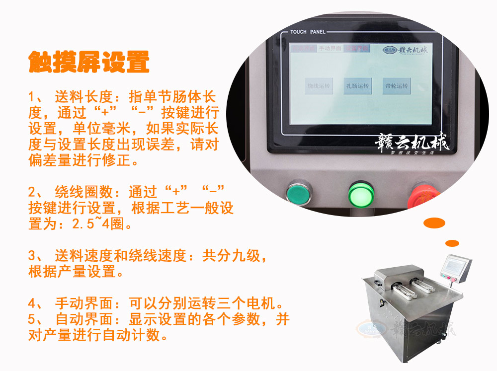 該香腸扎線機(jī)機(jī)械的優(yōu)點是節(jié)約腸衣,并且線扎的產(chǎn)品不用人工和機(jī)械剪節(jié),相對扭結(jié)可節(jié)約人工3人以上和對剪節(jié)設(shè)備的投入;相對半自動扎線機(jī)可節(jié)約10人的費(fèi)用,切免除工人的體力勞動之苦。該扎線機(jī)操控十分簡單,由于采用人機(jī)對話的液晶屏,設(shè)定長度和速度后,便可以讓機(jī)械自動高效完成所有工作。