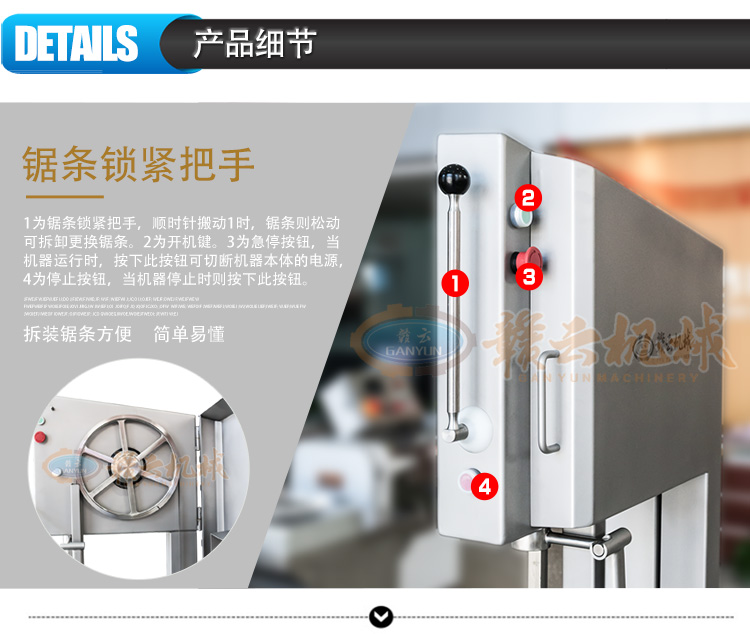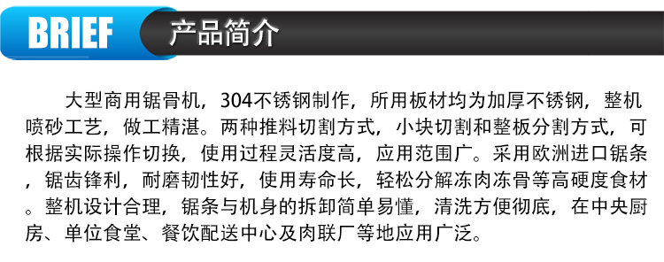 鋸骨機(jī),鋸骨頭用什么,骨頭克星 大型立式商用鋸骨機(jī),304不銹鋼制作,所用板材均為加厚不銹鋼,整機(jī)噴砂工藝,做工精湛。兩種推料切割方式,小塊切割和整板分割方式,可根據(jù)實(shí)際操作切換,使用過程中靈活度高,應(yīng)用范圍廣。采用優(yōu)質(zhì)鋸條,鋸齒鋒利,耐磨韌性好,使用壽命長,輕松分解凍肉凍骨等高硬度食材,整機(jī)設(shè)計合理,鋸條與機(jī)身的拆卸簡單易懂,清洗方便徹底,在中央廚房,單位食堂、餐飲配送中心及肉聯(lián)廠等地應(yīng)用廣泛。