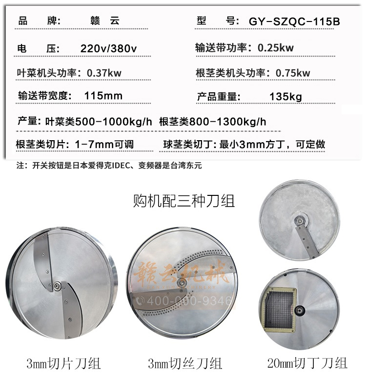 贛云115B型號數(shù)字雙頭切菜機,是原115型數(shù)字切菜機的升級版,采用新型機種設(shè)計,是中央廚房凈菜加工設(shè)備切割多元化設(shè)備之一,適用于葉菜類、球根類果蔬的切割,雙機頭切菜,切菜長度規(guī)格可調(diào),切菜速度和切刀速度變頻可調(diào),適用于切割范圍0-60mm。企事業(yè)單位食堂切菜能手。告別切菜煩惱,降低企業(yè)勞動成本,提高切菜效率和速度。