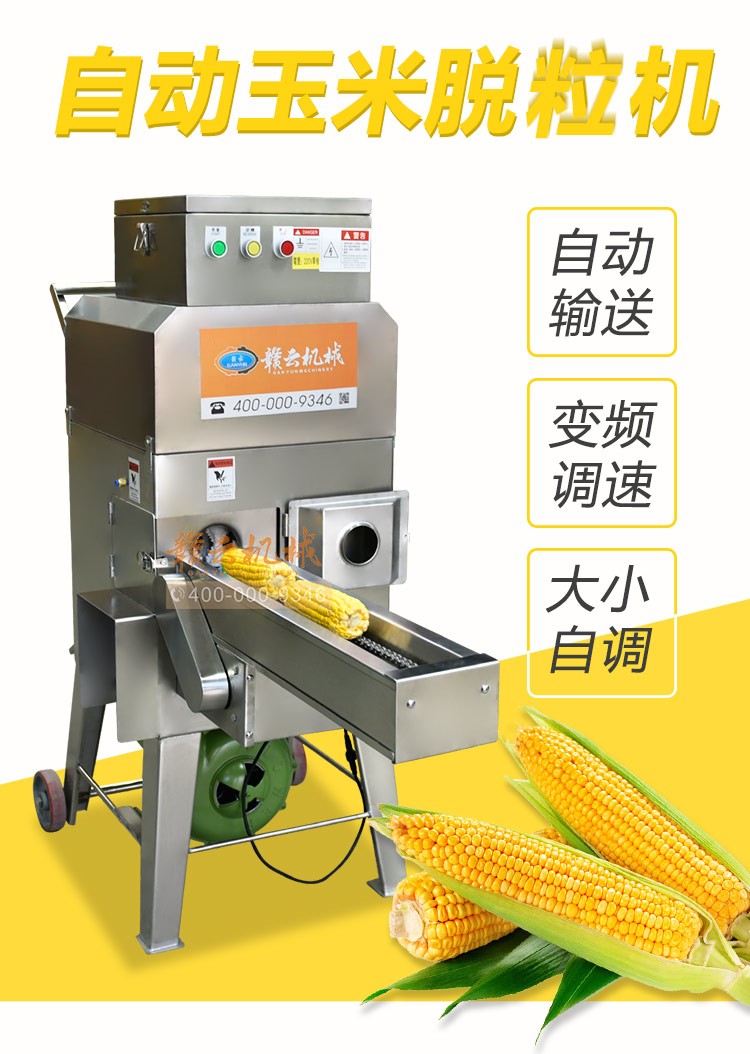 設(shè)計(jì)合理——整機(jī)采用全不銹鋼制造,配合腳輪移動(dòng)方便;變頻器控速、操作簡單;適合各種鮮、甜、糯玉米、凍玉米解凍后脫粒;