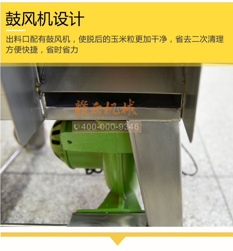 出料口配有鼓風(fēng)機(jī)使脫后的玉米粒更加干凈、美觀。