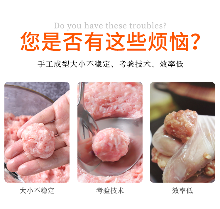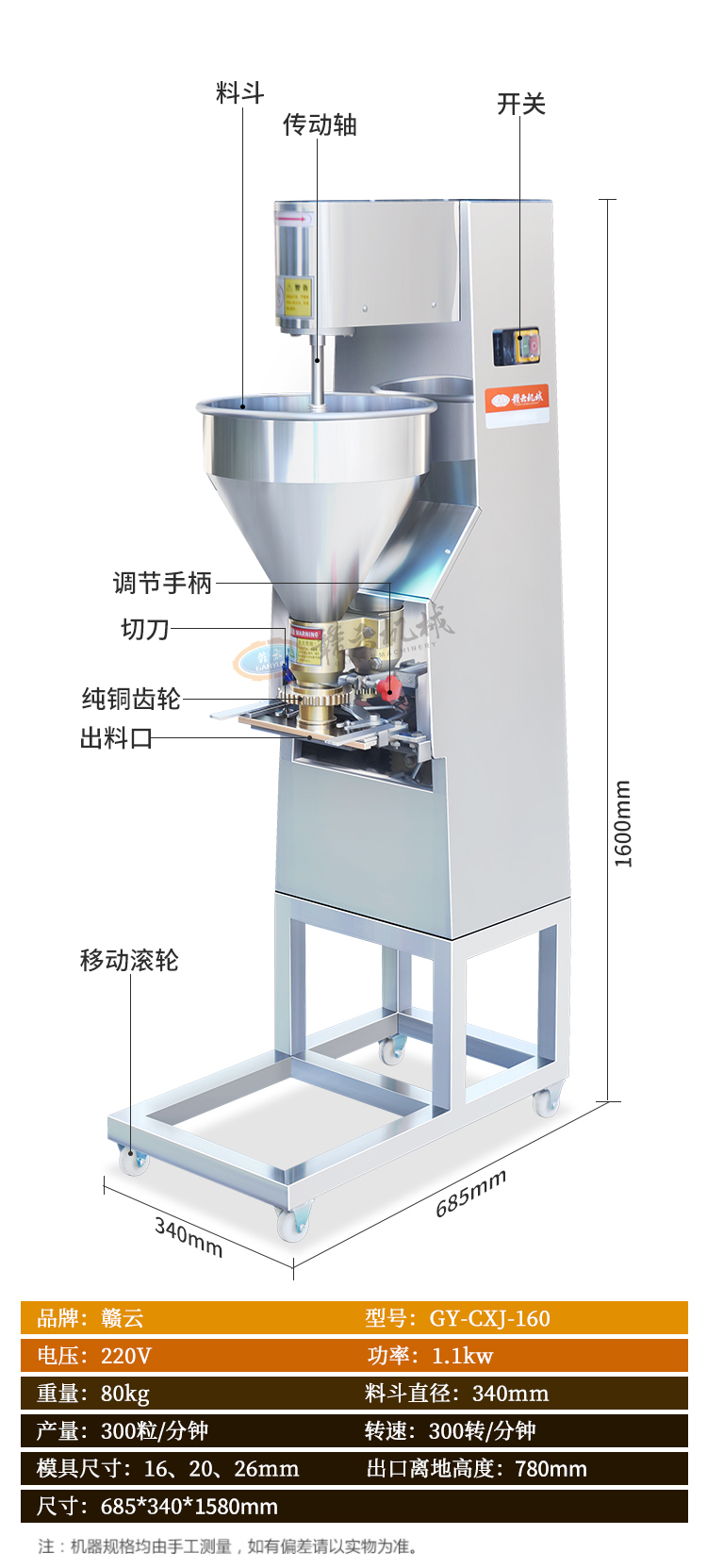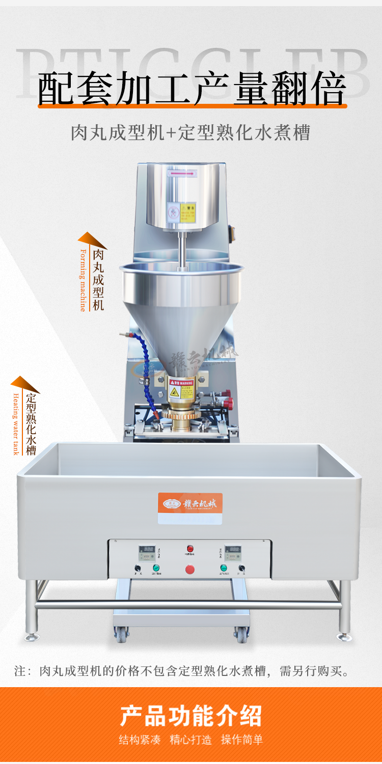 本款實(shí)心肉丸成型機(jī)是在120型實(shí)心肉丸成型機(jī)的基礎(chǔ)上加高設(shè)計(jì),是配合我司設(shè)計(jì)的雙加熱水槽而設(shè)計(jì),隨機(jī)配16、20、26MM三套成型模具,可做三種規(guī)格丸子,采用絞龍推料擠壓,切刀快速切割成型原理設(shè)計(jì),每分鐘可成型約260個(gè)肉圓,圓度可調(diào),是實(shí)心肉丸、魚丸、蝦丸、蟹丸、雞肉丸、素丸子等加工成型利器。