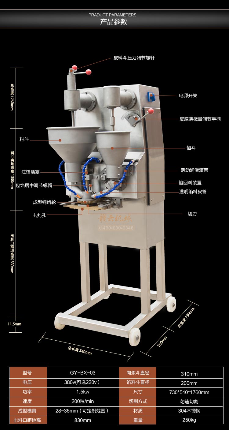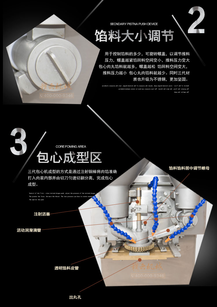 2014冬季新款包心肉丸機(jī),第三代肉丸包心機(jī)保留了二代包心機(jī)的全部?jī)?yōu)勢(shì)外,在包心成型速度上做了本質(zhì)上的突破,每分鐘成型200粒的速度是二代包心機(jī)的兩倍,機(jī)身表面接觸食物部位升級(jí),特殊處理更耐氧化和腐蝕,由于速度上的重大突破,因而稱之為第三代包心肉丸機(jī)。