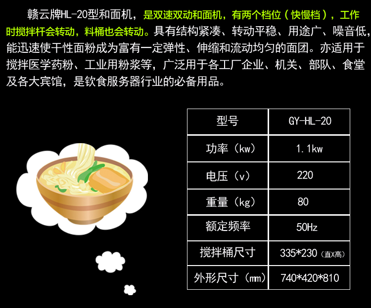 贛云牌HL-20型和面機(jī),立式雙速雙動型和面攪拌機(jī),有兩個(gè)檔位(快慢檔),工作時(shí)攪拌桿會轉(zhuǎn)動,料桶也跟隨轉(zhuǎn)動。具有結(jié)構(gòu)緊湊、轉(zhuǎn)動平穩(wěn)、用途廣、噪音低,能迅速使干性面粉成為富有一定彈性、伸縮和流動均勻的面團(tuán)。亦適用于攪拌醫(yī)學(xué)藥粉、工業(yè)用粉漿等,廣泛用于各工廠企業(yè)、機(jī)關(guān)、部隊(duì)、食堂及各大賓館,是飲食服務(wù)器行業(yè)的常見用品。我廠常規(guī)批量生產(chǎn)供應(yīng)的雙速雙動和面攪拌機(jī)有20L和30L兩種型號,如需更大規(guī)格可定做,如60L、80L,歡迎來電咨詢:電話0797-8373422