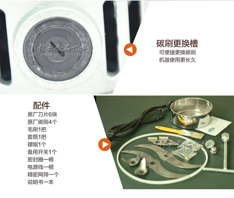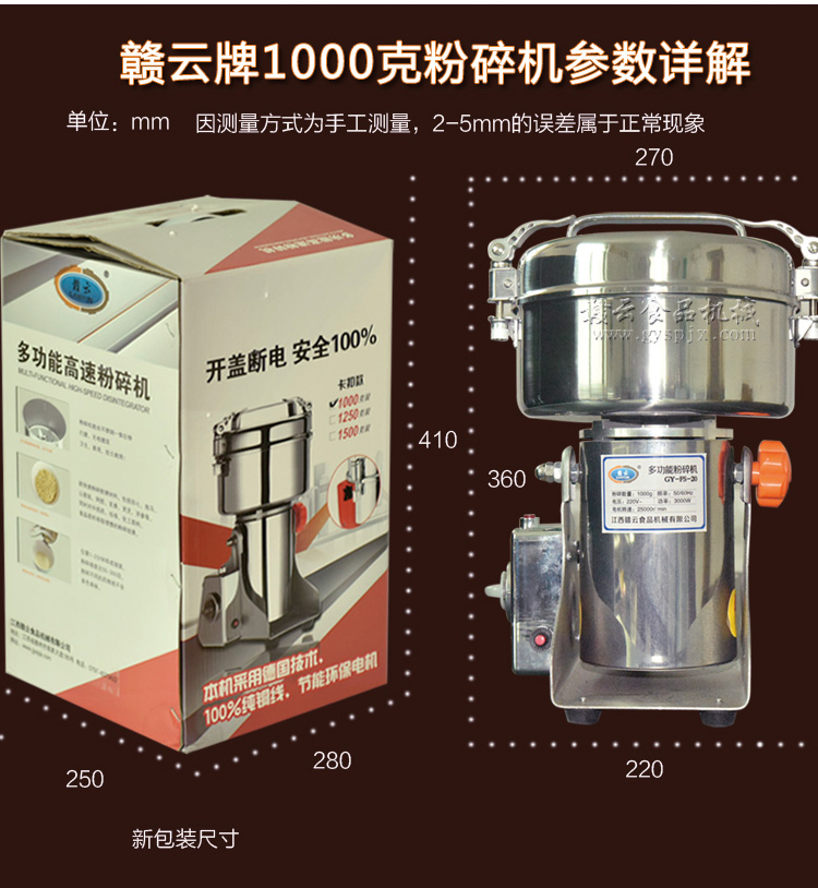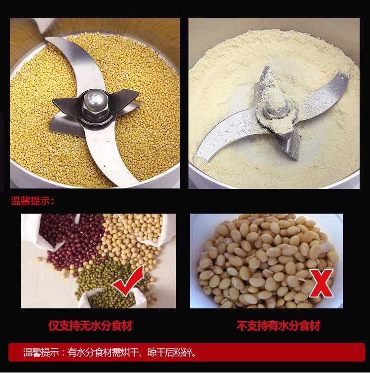 贛云系列多功能粉碎機采用純銅高速電機帶動粉碎刀片將物料快速打成粉末,可用于粉碎五谷、雜糧、田七、阿膠、白叁等,一般粉碎時間1-2分鐘即可,新款粉碎機改保險絲為空氣過載保護器,使用更安全,我廠提供的粉碎機有100克-2500克不同型號的多功能粉碎機。