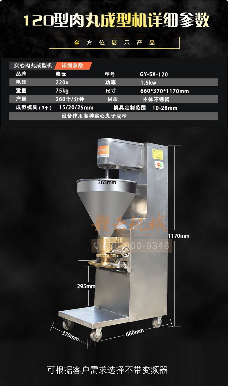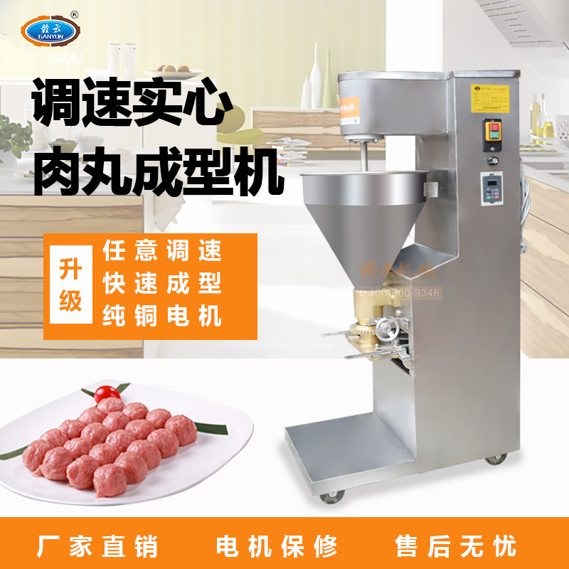 調速肉丸成型機是在實心肉丸成型機的基礎上,改開關控制為變頻數(shù)字調速控制,成型速度可變。是做實心豬肉丸、魚肉丸、牛肉丸成型不二選擇。詳細技術參數(shù)可參考實心肉丸成型機GY-SX-120型肉丸成型機。