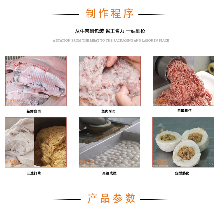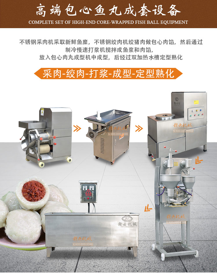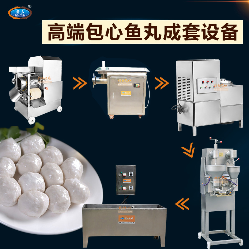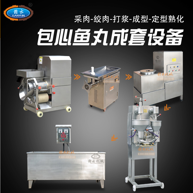 本套設備由:200型全不銹鋼魚肉采肉機、32型立式不銹鋼絞肉機、36型制冷慢速肉丸打漿機、三代肉丸包心機和智能溫控雙加熱水槽六臺設備組合而成。本套設備除了可以生產(chǎn)包心魚丸,還可生產(chǎn)實心魚丸