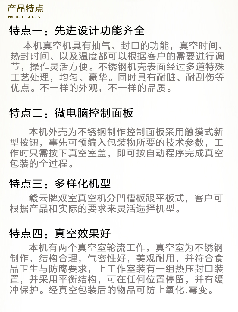贛云牌真空包裝機是一種新穎的包裝機械,它是將包裝袋內抽成真空后、立即自動封口,袋內真空度高,殘留空氣少,防止了細菌等微生物的繁殖、避免了物品氧化霉變和腐敗、同時對某些松軟的物品、經(jīng)人包裝后、可縮小包裝體積、便于運輸和貯存。