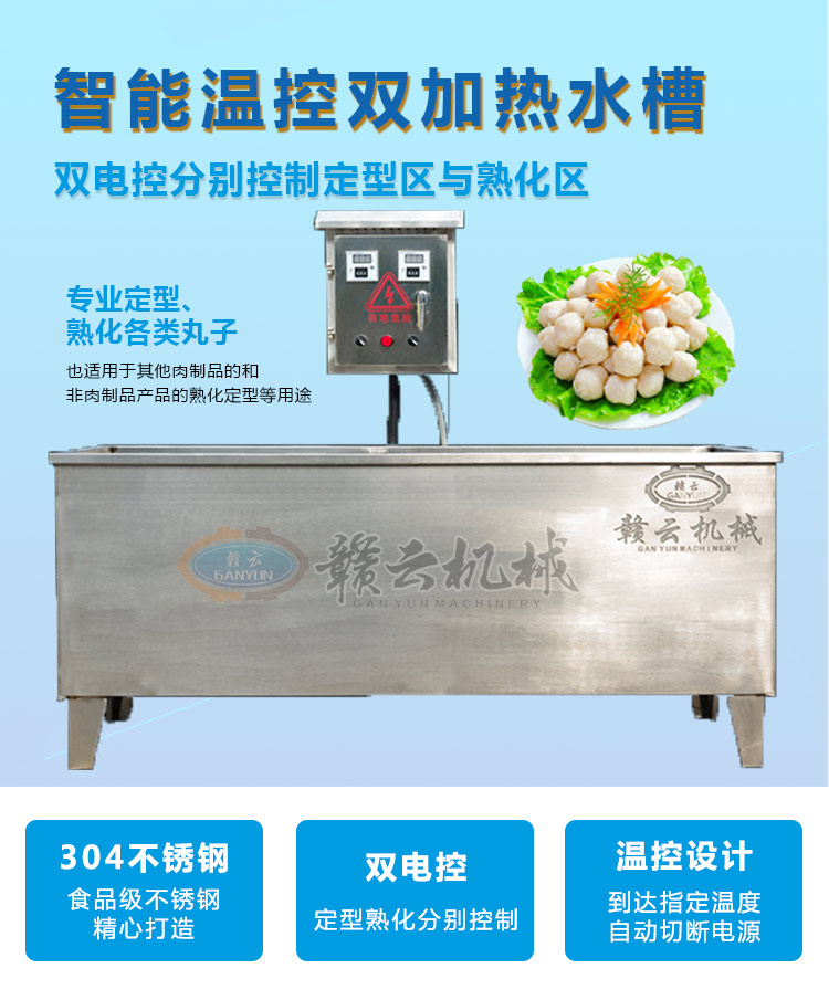 整機采用304不銹鋼板材設(shè)計,中間采用發(fā)泡劑,取保溫隔熱作用,雙槽加熱,獨立控制,定型熟化分別控制,加熱速度快,省電更省心。本產(chǎn)品量身設(shè)計可配套用于我廠生產(chǎn)的包心肉丸機、牛肉貢丸機、墨魚丸成型機、獅子頭成型機、雙調(diào)速肉丸機、火鍋丸子機組等多種肉丸成型設(shè)備使用。可加油,用于油炸丸子的定型熟化,可加水,用于各種肉丸的定型熟化,根據(jù)其加熱作用原理,也適用于其他肉制品的和非肉制品產(chǎn)品的熟化定型等用途。