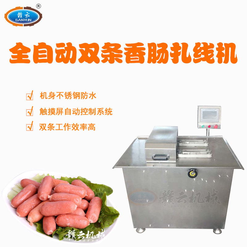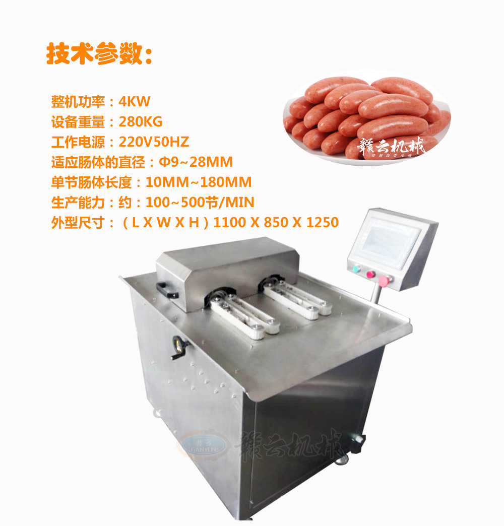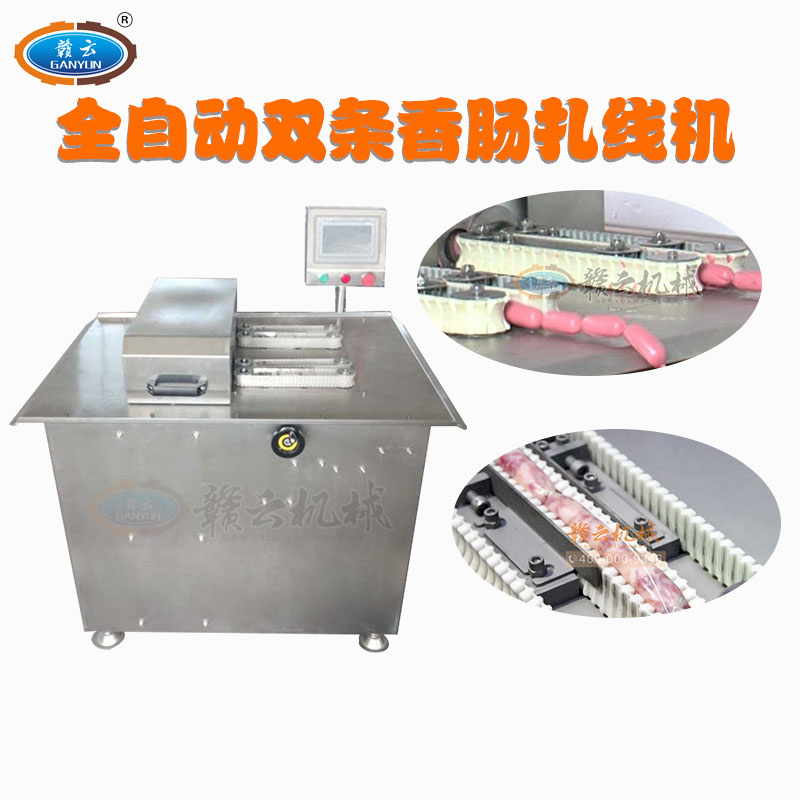 全自動雙路高速香腸扎線機,自動分份,自動繞線,全程自動化控制。該機采用了優(yōu)質電機和本公司自主研發(fā)的控制系統(tǒng),機身全不銹鋼制造、效率高、易操控、節(jié)約生產原料等優(yōu)點,產品長度的調節(jié)可以隨心所欲