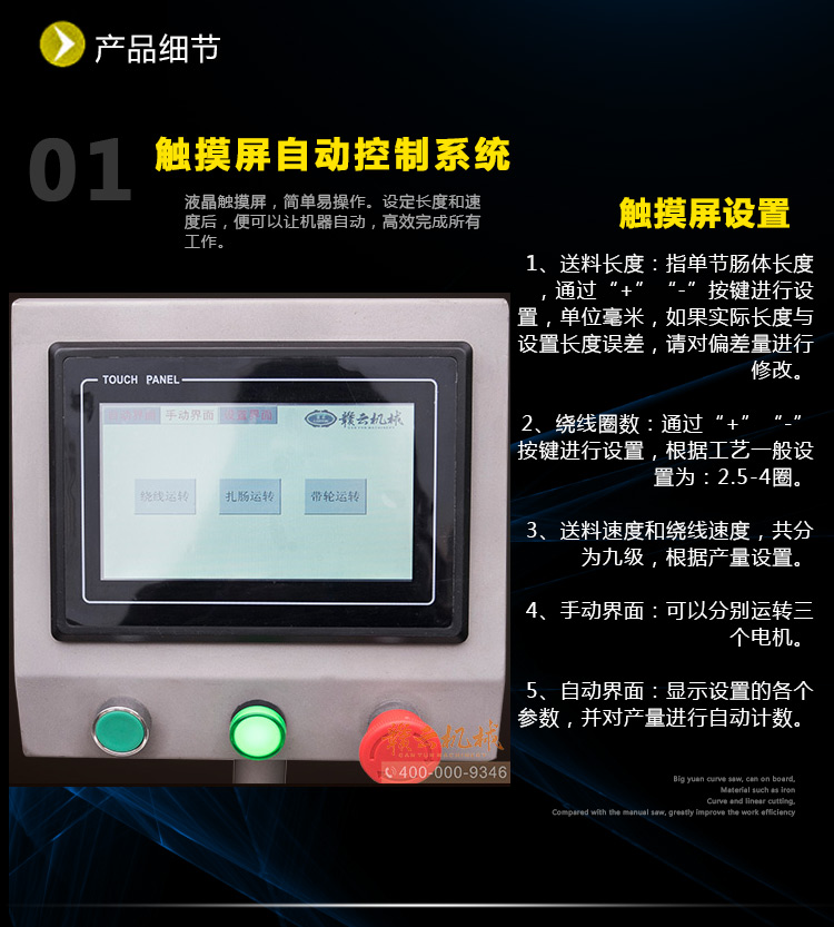 該香腸扎線機機械的優(yōu)點是節(jié)約腸衣,并且線扎的產(chǎn)品不用人工和機械剪節(jié),相對扭結(jié)可節(jié)約人工3人以上和對剪節(jié)設備的投入;相對半自動扎線機可節(jié)約10人的費用,切免除工人的體力勞動之苦。該扎線機操控十分簡單,由于采用人機對話的液晶屏,設定長度和速度后,便可以讓機械自動高效完成所有工作。