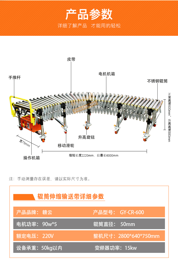 此為6米輸送線,長度可伸縮2.2-6米,高度可調(diào)節(jié)60-90 厘米之內(nèi)。每米配置10根直徑為50毫米輥筒,每米配220v 90w電機一臺,可定制其它尺寸。