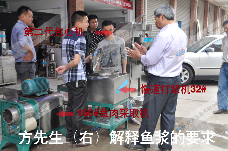 2012年5月5日上午,贛云接待了來自湖北魚丸生產(chǎn)的方先生,按照方先生自家包心魚丸生產(chǎn)配方的需求,購買了40多斤魚,等比例淀粉,豬肉5斤,生姜若干,鹽一包,其他配料若干。本次試機(jī)演示了4臺設(shè)備用于制作包心魚丸,以下是試機(jī)過程實(shí)拍圖片。