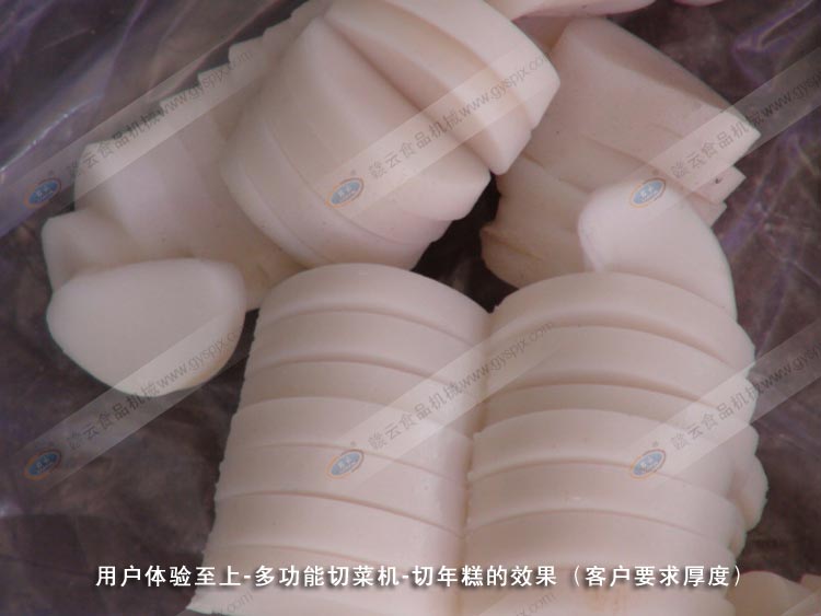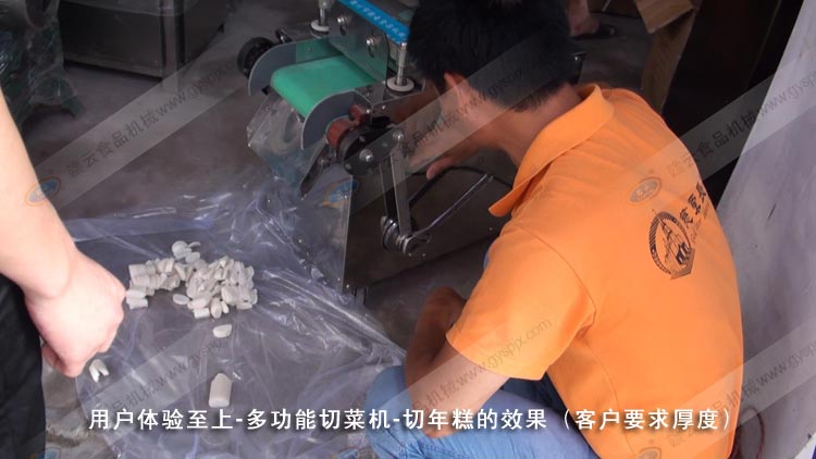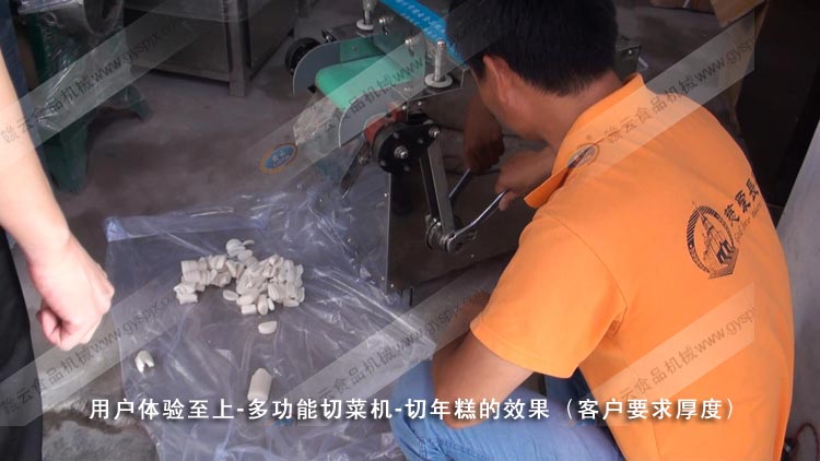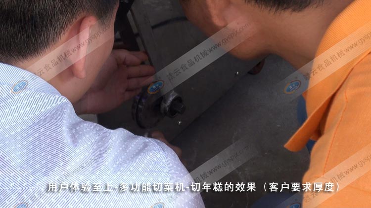 2012年6月27日上午,贛云接待了來自浙江溫州市王先生,體驗多功能切菜機(GY-QC-660)切年糕片的效果,試機過程,贛云技術人員演示了切菜機的走刀量的調整,王先生也親自掌握了走刀量調整操作技術要點,以下是試機過程實拍圖片:
