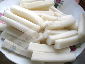 將上好的糯米洗干凈,用水泡8-12小時(shí)直至泡漲為止,然后緩慢倒入自熟年糕粉絲機(jī)內(nèi),采用高溫發(fā)熱片,這樣可以直接做出自熟的年糕,用剪刀剪成小段,然后冷卻,用切年糕機(jī)(多功能切菜機(jī))切成片即可。
