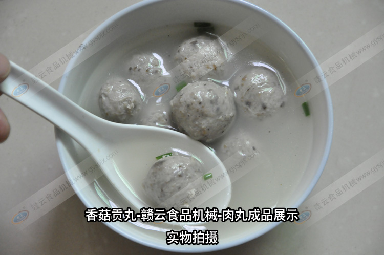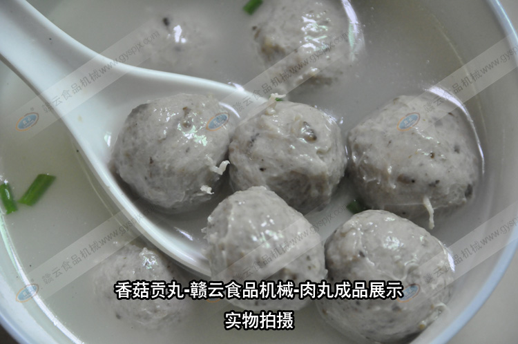 贛云食品機械肉丸成套設備的結晶,香菇貢丸,合作客戶獨家配方,用贛云牌肉丸設備制作的香菇貢丸,味美,有嚼勁,香菇原味,保證您吃了還想吃。香菇貢丸所需設備:自動絞肉機一臺,高速打漿機一臺,慢速打漿機一臺,食物切碎機一臺,貢丸機一臺,自動煮丸水槽一臺即可現做現賣,也可接單定做。相關設備的工作內容:自動絞肉機碎肉,高速打漿機將肉?焖俅虺扇鉂{,慢速打漿機將肉漿調味,食物切碎機將香菇切成細小顆粒,放入慢速漿機中和肉漿一起調勻入味,貢丸機將肉漿成型貢丸,自動煮丸水槽將成型后的肉丸初步定型。批量的香菇貢丸就是這樣制作而成。