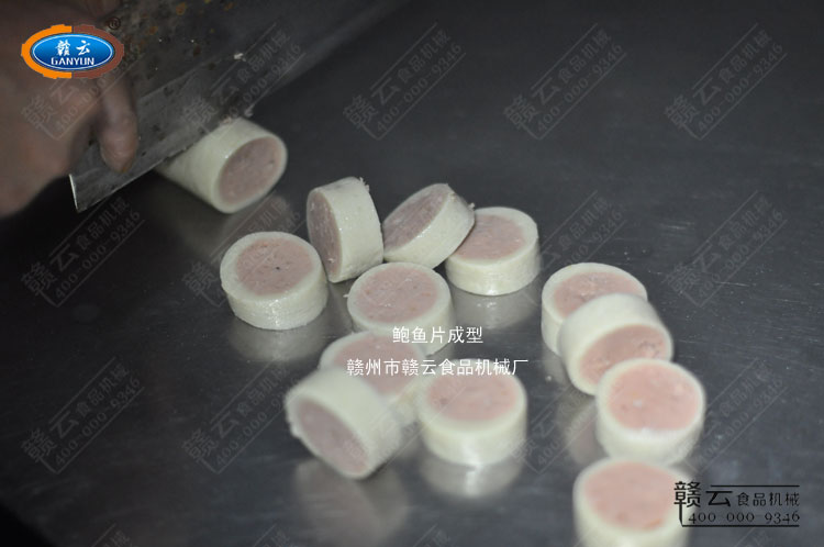 3、鮑魚棒成型:一臺(tái)泵浦灌腸機(jī)灌漿,一臺(tái)泵浦灌腸機(jī)灌肉餡,都連接鮑魚片成型工具成型鮑魚棒,通過加熱水槽定型熟化,再由切菜機(jī)切斷成鮑魚片。