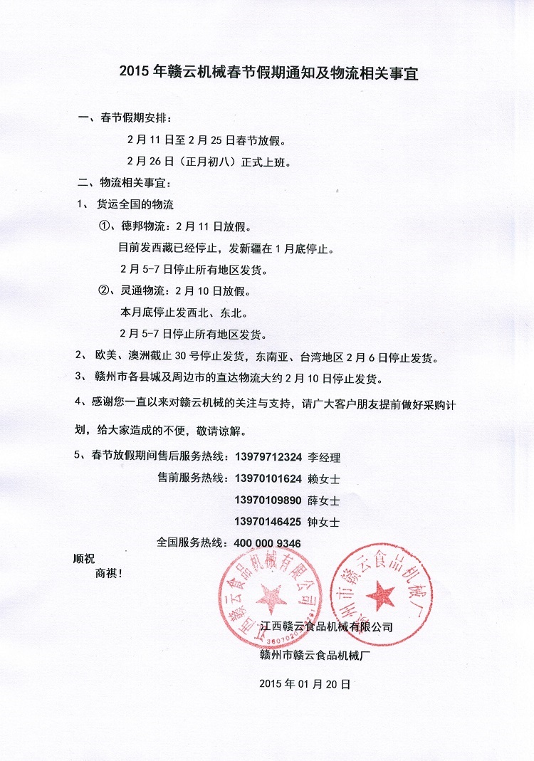 2014年終物流停運(yùn)通告與2015年春節(jié)假期通知