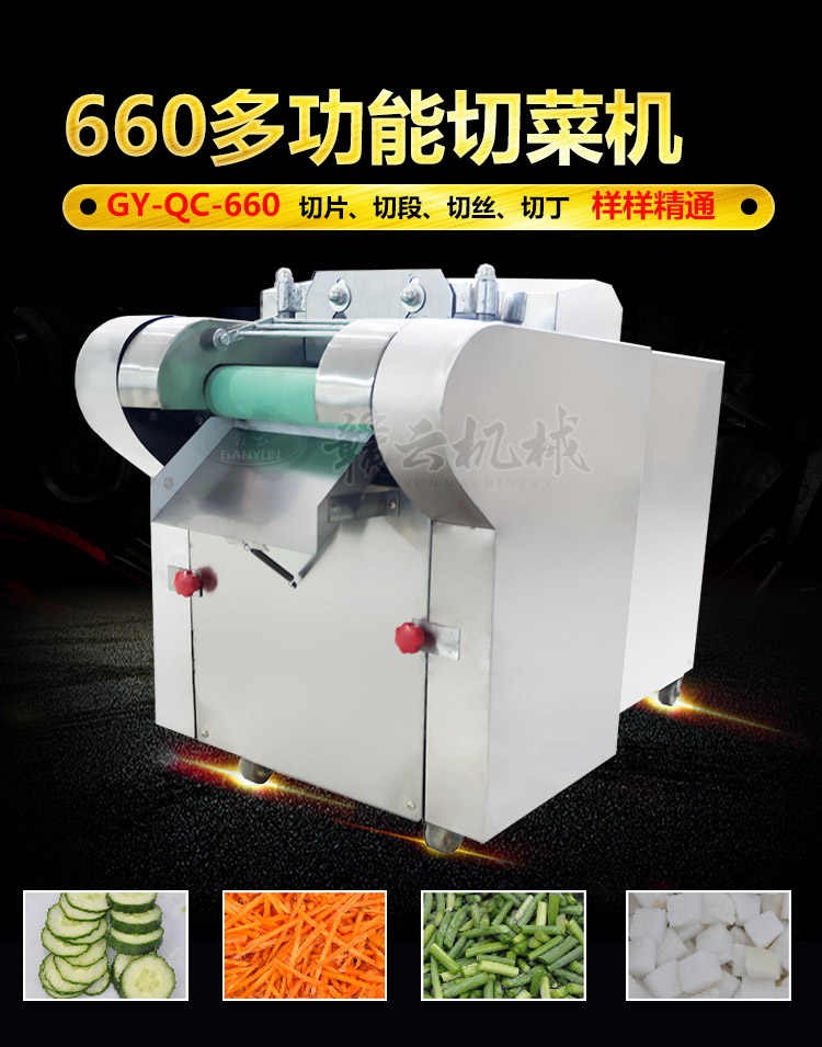 一機(jī)多用,擁用切菜機(jī)、切丁機(jī)、切絲機(jī)、切片機(jī)的功能,集多功能于一身?蓪⒏o類切成厚、薄片、絲條、丁等外形。葉菜類之輸送帶轉(zhuǎn)刀速度采用變頻器控制,獨(dú)立控制。成品形狀: 片、四角絲條、丁。