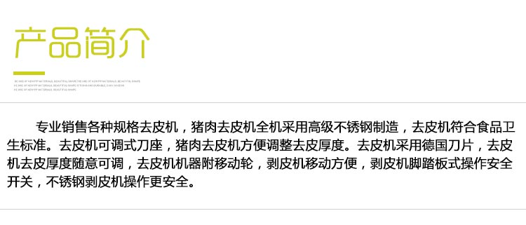 扒皮機(jī)全機(jī)采用高級不銹鋼,符合國家食品衛(wèi)生標(biāo)準(zhǔn)?烧{(diào)式刀座,方便調(diào)整去皮厚度。采用優(yōu)質(zhì)刀片,馬力十足,清洗方便,無需拆卸簡單操作,輕松清洗,操作桿靈活自由變動,機(jī)器附移動輪,撥皮更方便,腳踏板式操作安全開關(guān)。不銹鋼撥皮機(jī)操作更安全,機(jī)器小巧靈便。