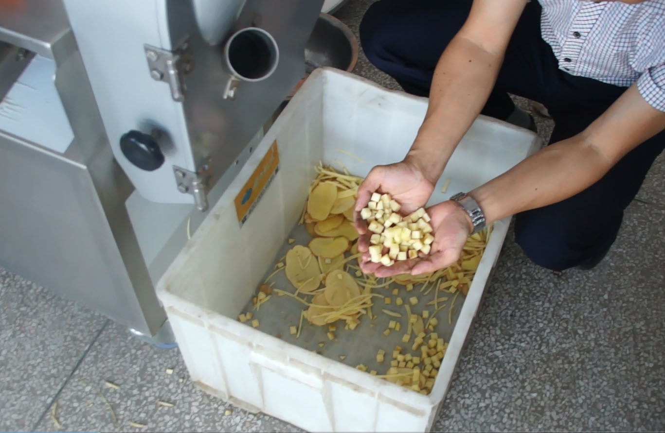 本次客戶一共試了兩款機(jī)器,其中一款是多功能切菜機(jī),此款多功能切菜機(jī)可以根據(jù)自身要求調(diào)整,能夠切丁,切片,切絲等多種功能。以下是切菜機(jī)效果。