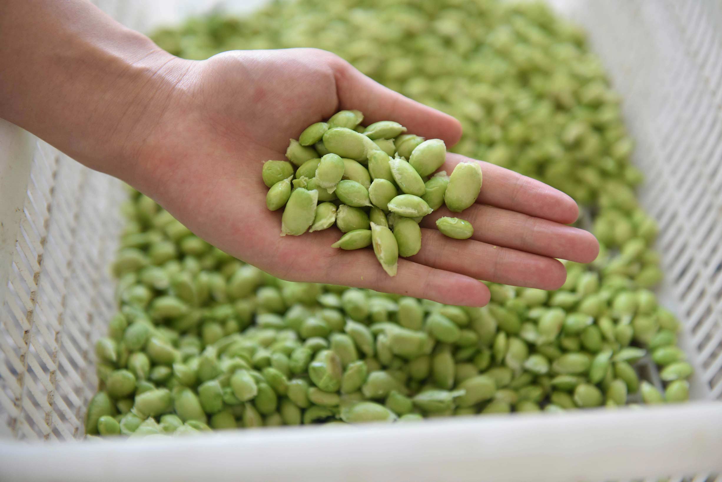 另一款是毛豆脫皮機(jī),這款機(jī)器的特點(diǎn)是剝出來(lái)的毛豆帶衣,顆粒飽滿。以下是試機(jī)效果