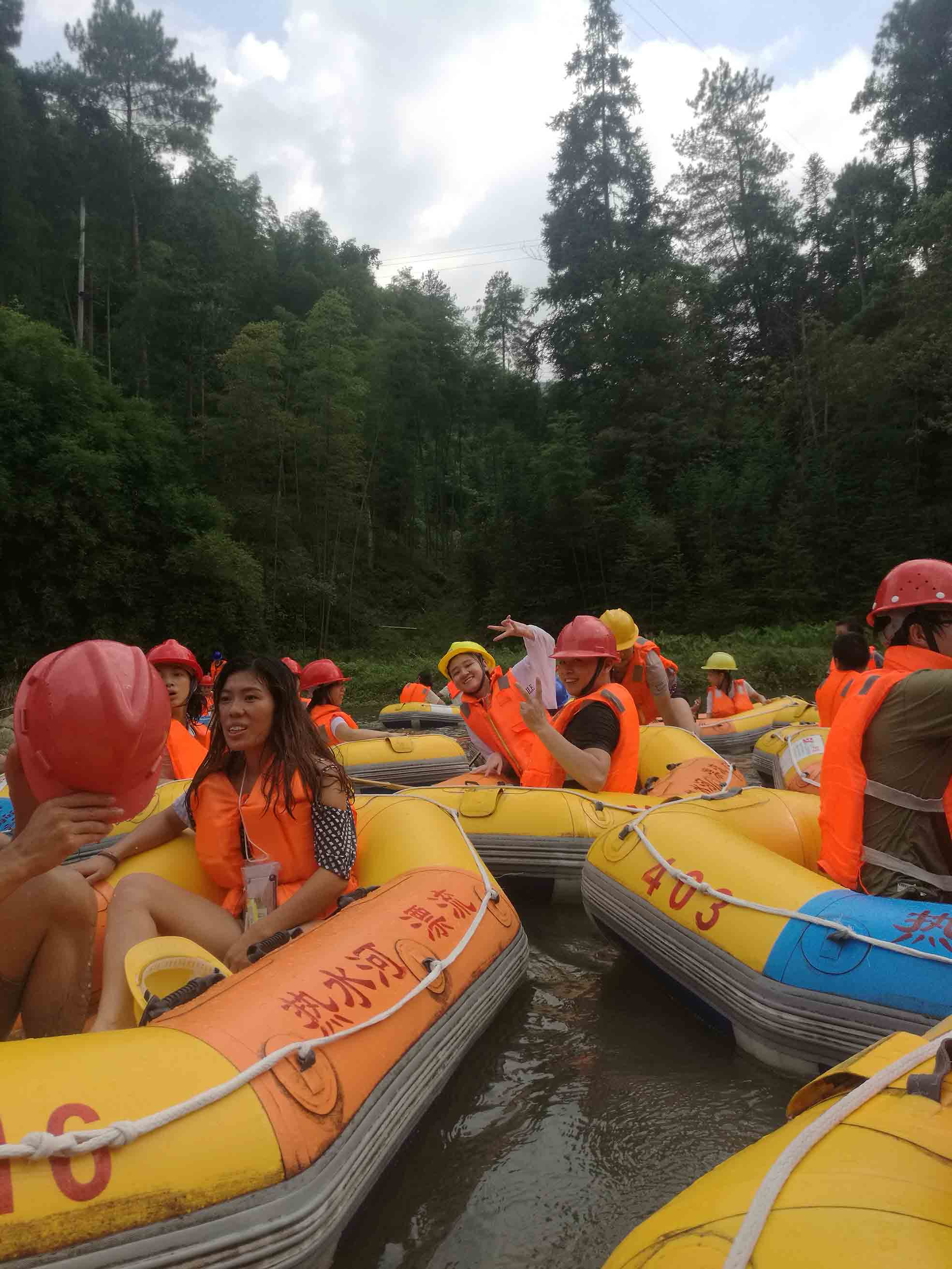 中午,大家集合聚餐。在農(nóng)家的院子里,體驗鄉(xiāng)村的生活,大家互相交流情感。吃了農(nóng)家菜之后,便開始走上了漂流之旅,此次漂流的地點是在湖南汝城熱水河漂流,兩岸青山依依,竹海呢喃,自然形成的青石河,小橋、古樹、田野、村莊,無限風(fēng)光。大家駕駛著雙人座特制橡皮艇,穿峽谷、越險灘,時兒急流激蕩,時兒緩流輕越,迎面而來的是一種其樂無窮的驚、險、奇。在比較平緩的水灘上大家在享受優(yōu)美自然景色,打水仗等,同時,也不忘留影紀(jì)念,這次旅游不但營造了和諧融洽的集體氣氛,而且增進了彼此的情感。
