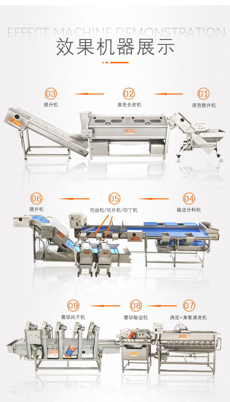 他集浸泡機(jī),清洗機(jī),提升機(jī),切割機(jī),風(fēng)干機(jī)等多種機(jī)器為一體,實現(xiàn)了瓜果從剛摘到可下鍋炒的全部過程,完美的節(jié)省了人力及時間,下面的圖片將詳細(xì)介紹這些設(shè)備。