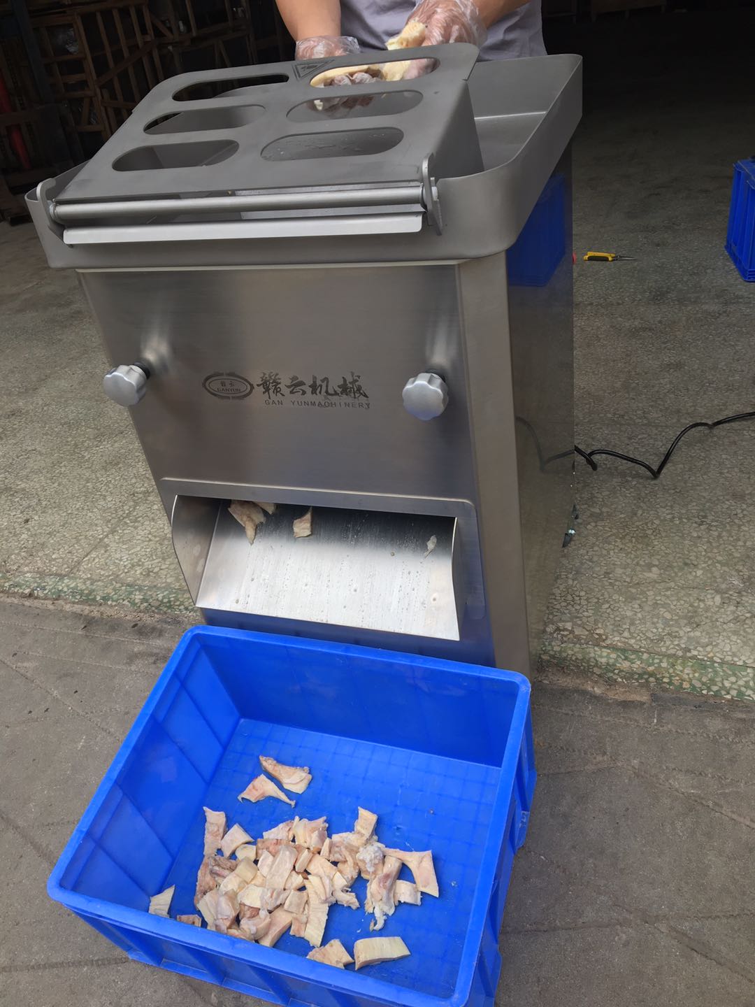 接通電源后就把拆開的快遞里面的牛板筋拿出來了,按下開關機器里面的刀組就飛快的旋轉起來了,把牛板筋橫著放進行,馬上就從出料口出來,中間過程干凈利索,沒有任何的停頓,因為這個客戶要求的尺寸比較大所以切割出來的效果稍微有點大,如果想切得更小些可以使用更緊密的刀組或者進行第二遍切割即可。