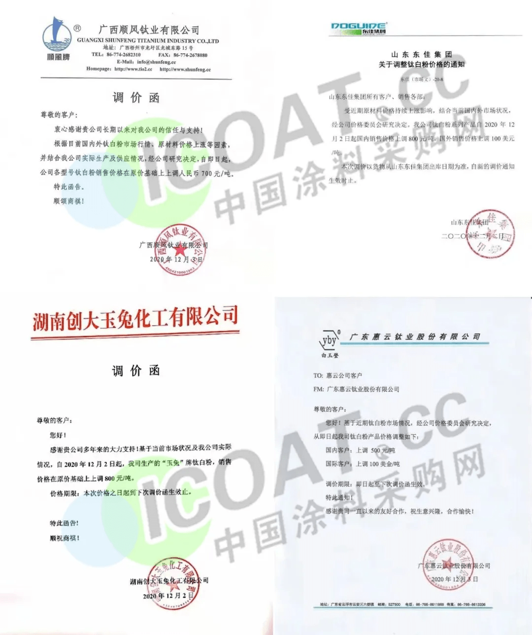 2020年12月1日起,鈦白市場再次掀起新一波漲價潮。據(jù)不完全統(tǒng)計,目前已有近20家主流鈦白廠商發(fā)布漲價通知,其中包括龍蟒佰利聯(lián)、攀鋼、海峰鑫、山東道恩、廣西順風(fēng)等。此次調(diào)價鈦白企業(yè)調(diào)價幅度多為700-1000元,且已經(jīng)開啟了全年第8輪調(diào)價,累計調(diào)漲最高5300元/噸。