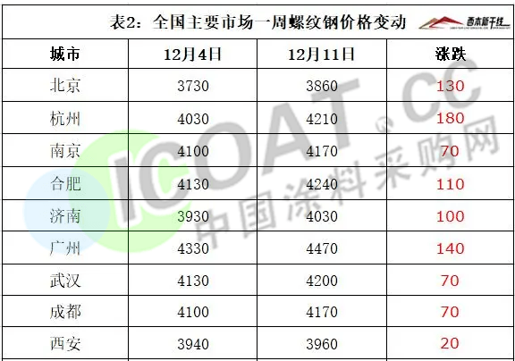 受黑色系期貨連續(xù)拉漲,以及原料價格整體走強等因素提振,國內(nèi)建筑鋼材迎來一波強勁反彈。12月11日,北京地區(qū)調(diào)漲130元/噸,杭州調(diào)漲180元/噸,南京調(diào)漲70元/噸,合肥調(diào)漲110元/噸,濟南調(diào)漲100元/噸,廣州調(diào)漲140元/噸,武漢、成都、西安調(diào)漲70元/噸。