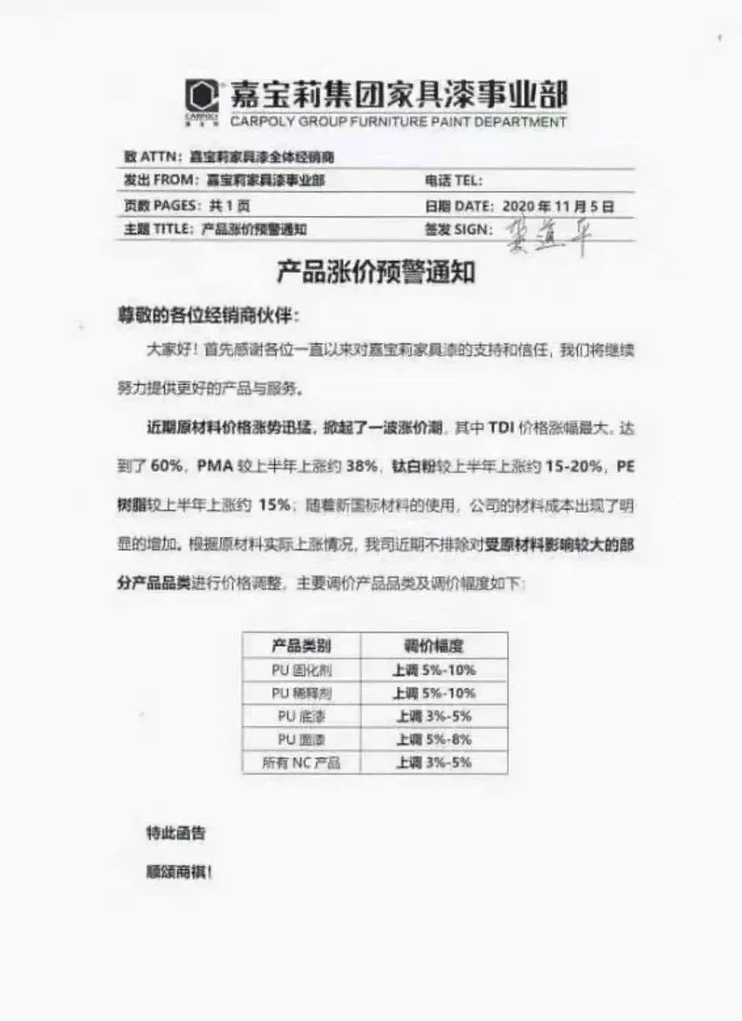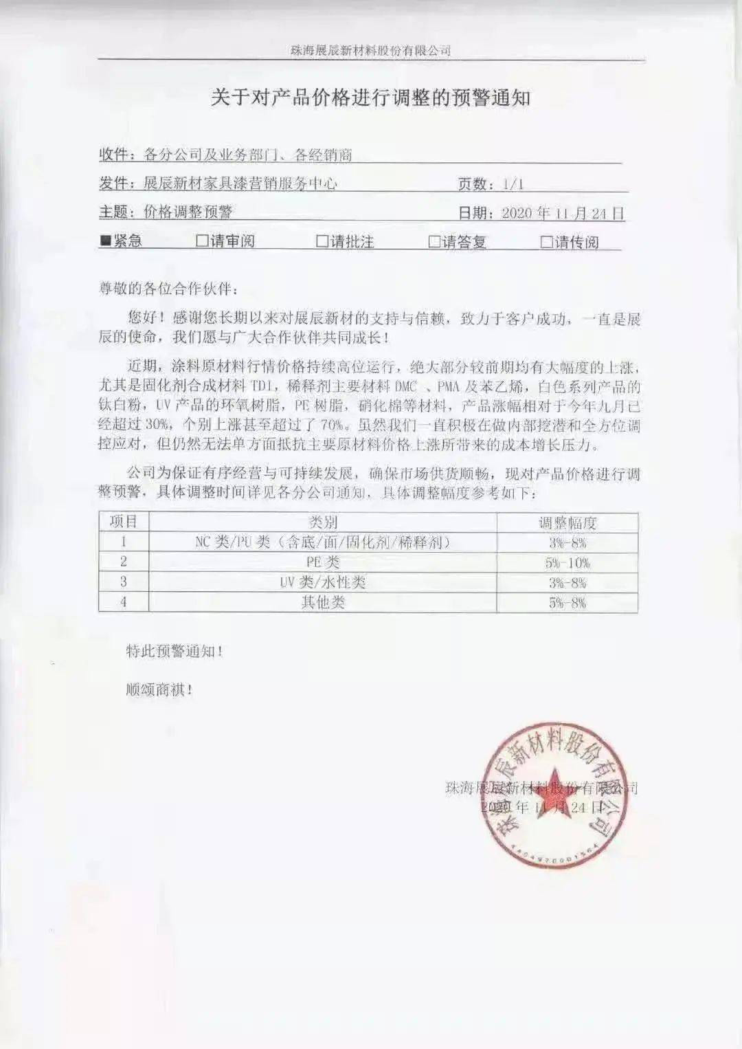 早在今年11月3日,以重防腐涂料為主營業(yè)務(wù)的無錫福斯特涂料有限公司則對外發(fā)布調(diào)價通知函,宣布:于2020年11月3日起在現(xiàn)售價基礎(chǔ)上:溶劑型涂料上調(diào)10%,水性涂料上調(diào)5%,其余系列產(chǎn)品全部上調(diào)5%。