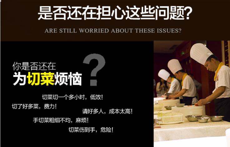 對于飯館,酒店,商業(yè)廚房等來說,切菜的數量龐大,使用人工不緊效率低,而且在長時間的切菜過程人,人的體力,注意力都會下降,導致容易受傷,而受傷不緊影響整體運行,又耽誤工作,對于廚房工作者來說,都希望在短時間內將工作做好,但速度快了又怕出錯遭殃。