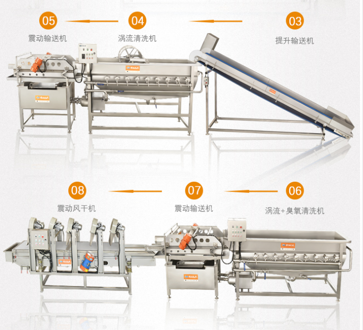 渦流振動清洗機(jī)采用螺旋狀混合水流清洗物料,高頻振動噴洗過濾,以延長清洗路徑,節(jié)約水源。二次沉淀過濾水循環(huán)系統(tǒng),高效節(jié)能。機(jī)體內(nèi)設(shè)有臭氧發(fā)生器,高效降解果蔬殘留的化肥、農(nóng)藥等有毒物質(zhì),清除化學(xué)添加劑、激素等有害物質(zhì),殺滅海鮮中容易引起中毒的嗜鹽性菌等,以保證物料的鮮度。