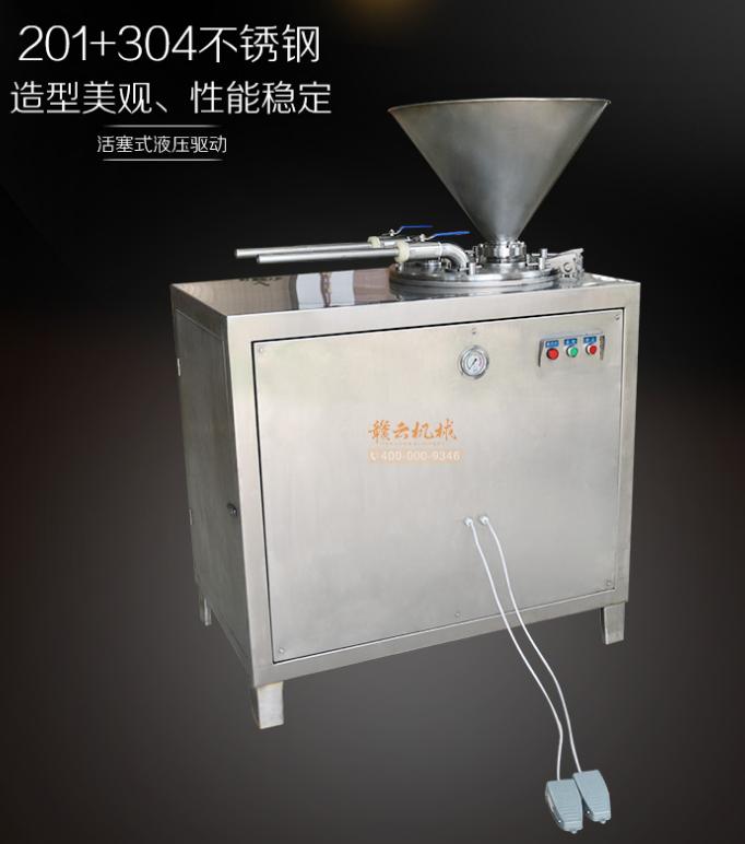 不銹鋼液壓灌腸機是一款可灌制不同腸類的機器,比較適用于:家鄉(xiāng)臘腸、火腿腸、肉泥腸、紅腸、廣式臘腸等不同類似和風味的香腸。機器采用不銹鋼材料、料斗、工作缸、液壓操作系統(tǒng)和電氣系統(tǒng)組成,主要工作原理是通過操縱轉閥控制活塞的往復運動,以完成吸料與擠料的運作,達到連續(xù)灌腸的目的,機器擁有兩個出料管,50L的大容量料桶,讓灌制香腸的效率更高。