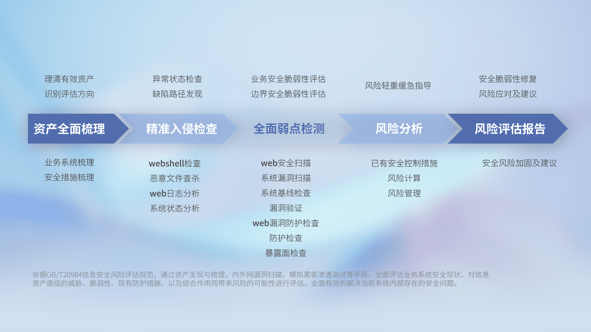 针对客户行业特性,,,以专业的安全服务+多厂商联合解决方案提供专属的一站式安全管理服务,,,帮助客户全面感知网络空间威胁,,,基于识别、、、检测、、、分析、、、、防护、、、、监测、、、响应的服务理论模型,,,从方案咨询、、、集成交付、、、评估验证、、、优化加固、、、运维运营,,致力于为客户提供完整的闭环管理式安全服务。。。。以实战经验为客户打造高抵御风险的安全体系,,,,帮助客户发现威胁、、对抗威胁、、处置威胁,,,不断积累安全对抗能力,,持续保障数字化安全。。
